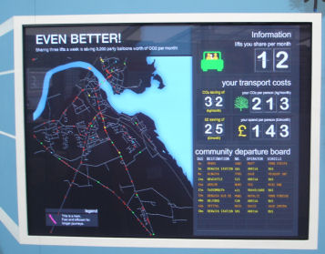 A great computer-based interactive at the DoTT07 Festival is in the Movement area. A digital map of the roads of the North East shows little dots moving around the area. Colour coded for the type of vehicle and number of passengers, the map clearly shows areas of considerable congestion. A “road” protrudes from the front of the display, on this are footprints for the number of people in your own vehicle. As this increases, from 1 to 4, a calculator shows the price per person decreasing, along with the environmental cost – expressed in carbon dioxide.