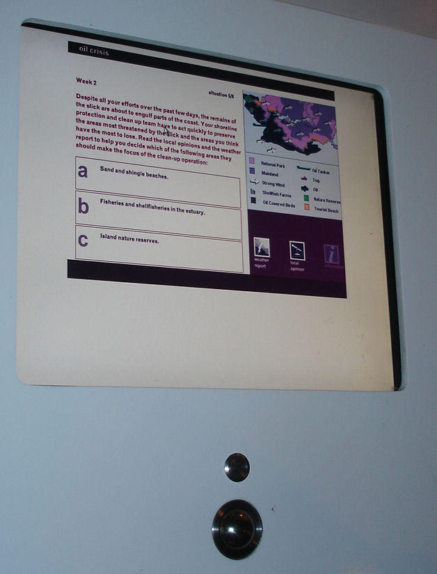 A nice environmental management simulation challenges the visitor to manage an oil-spill. It is nicely thought out, only undermined by the amount of text – I watched a group of children have a quick look and move on.