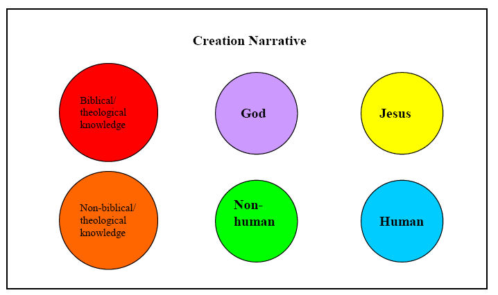 It did though, produce diagrams that well show the focus groups perspective. Given a colour coded diagram structure (right) the two workshop groups were prompted to explore the creation narrative (nearly wrote myth) with reference to sustainability (or perhaps the other way around!). ![]()