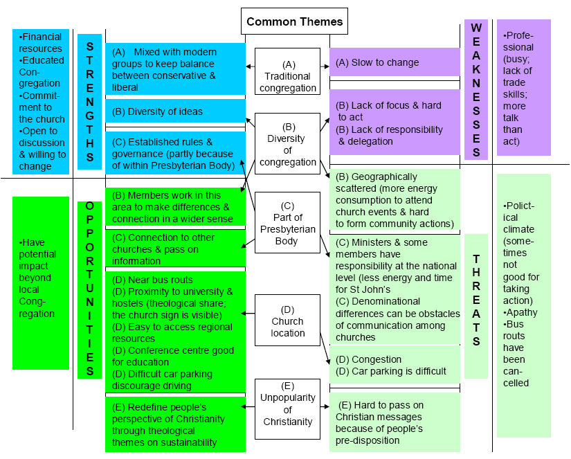 these discussions – reduce paper waste, maintain appliances and so on. Perhaps the participants knew this too, there’s more depth on a SWOT analysis and from this they plan a “faith-based” green plan which is a deliberate attempt of “movement in the same direction”. In later sessions, the groups established a “group theological study on sustainability” and “group eco-discussion”.
