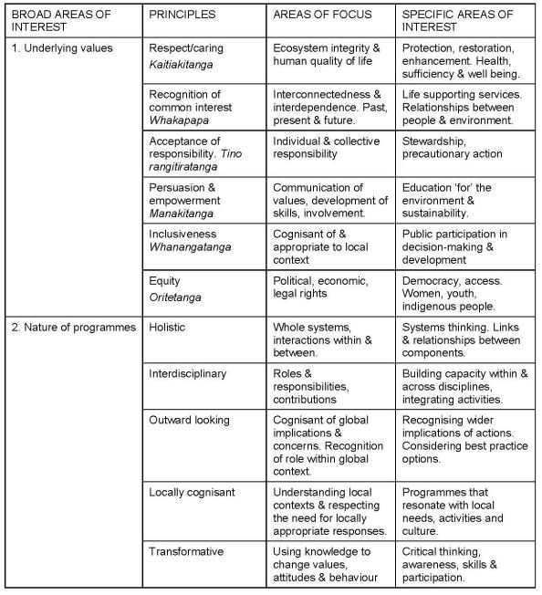 Six broad areas of interest emerged: underlying values; the nature of educational programmes; the nature of the knowledge and understanding conveyed; target audiences; institutional requirements; and educational research and development. Each has its own set of principles, areas of focus and specific areas of interest.