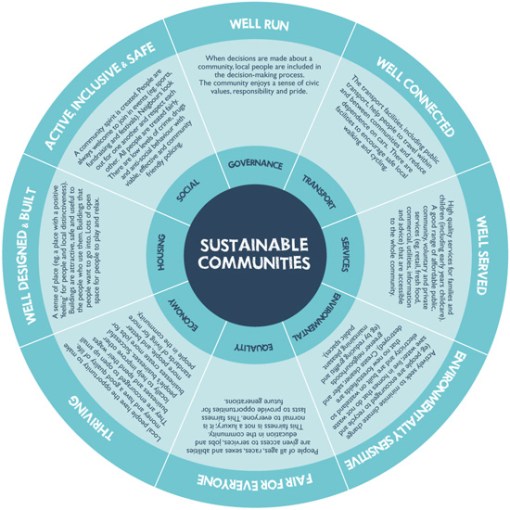 Sustainable communities meet the diverse needs of existing and future residents, their children and other users, contribute to a high quality of life and provide opportunity and choice. They achieve this in ways that make effective use of natural resources, enhance the environment, promote social cohesion and inclusion and strengthen economic prosperity.
