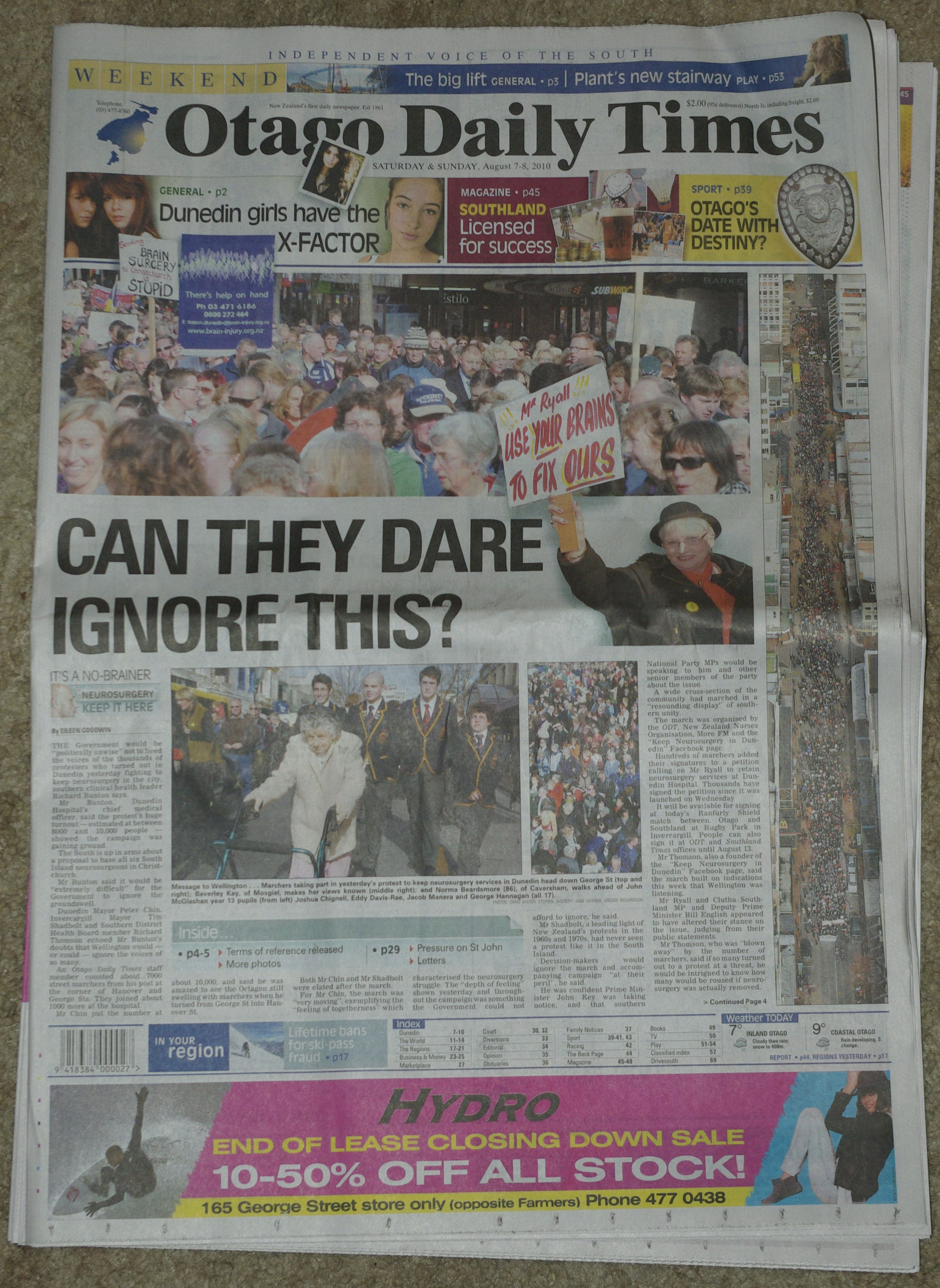 ODT “up to 10,000 marched through central Dunedin at lunchtime today protesting the possible loss of neurosurgery services”.