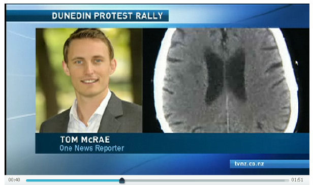 TV One news. Tom McRae on the phone during the march, and a track of Peter Chin.