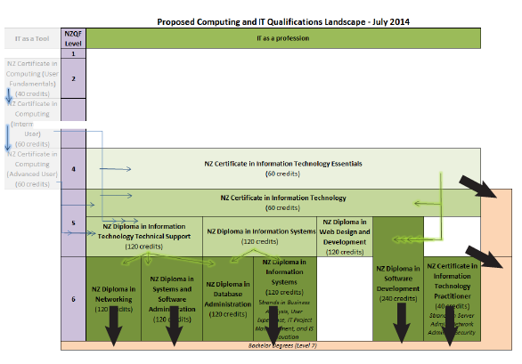 The landscape represents two separate streams – ‘IT as a tool’ computing qualifications and ‘IT as a Profession’ information technology qualifications, as well as a bridging qualification. There are 14 qualifications on the landscape, set to replace all sub-degree (certificates and diplomas) in New Zealand (see the full list). These qualifications have emerged from three previous rounds of consultation, and a great many meetings of working groups.