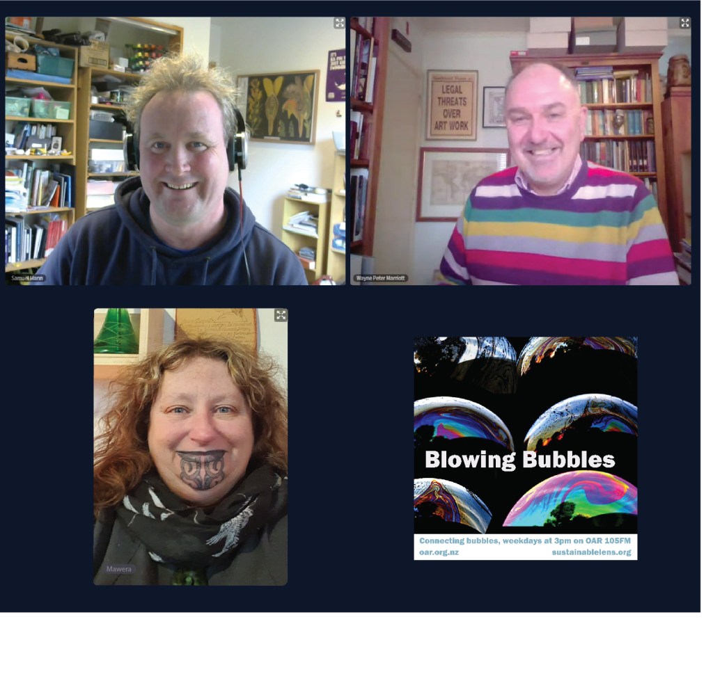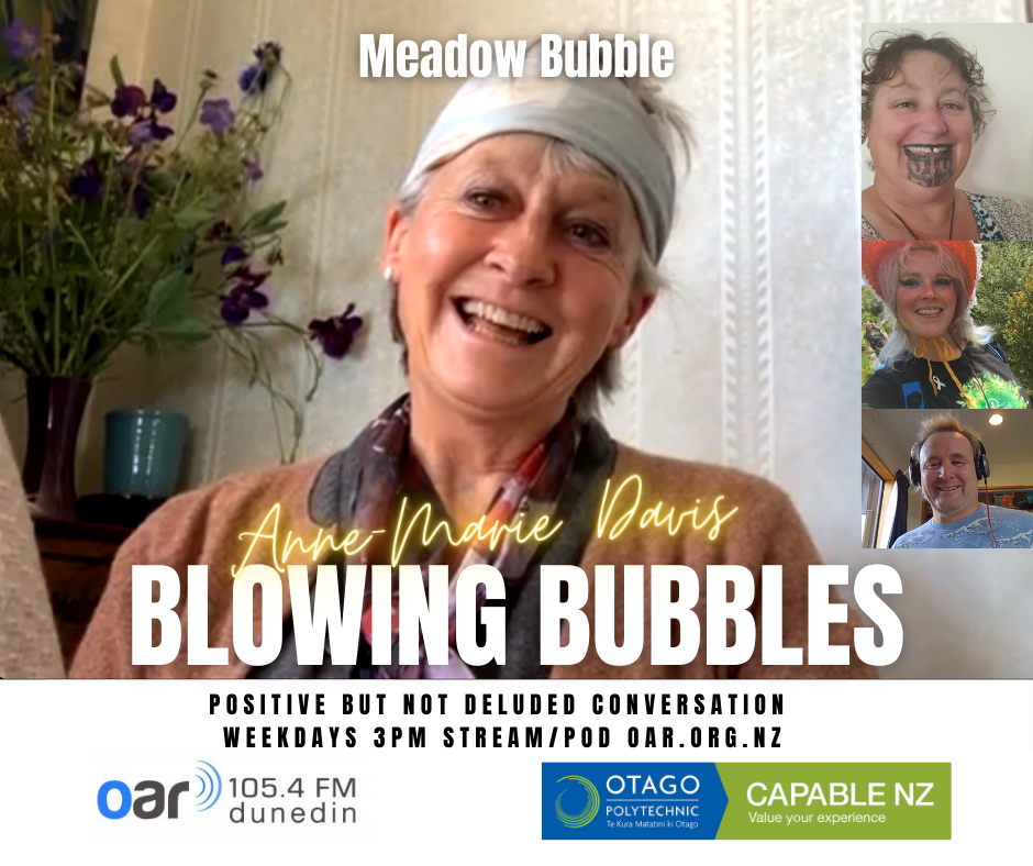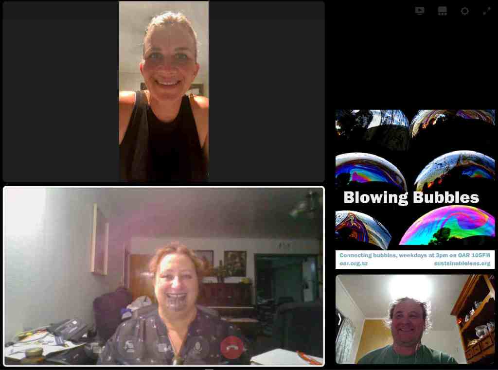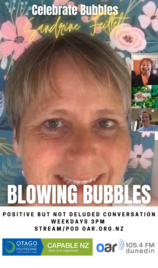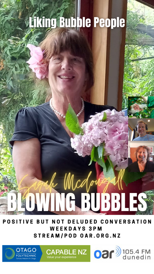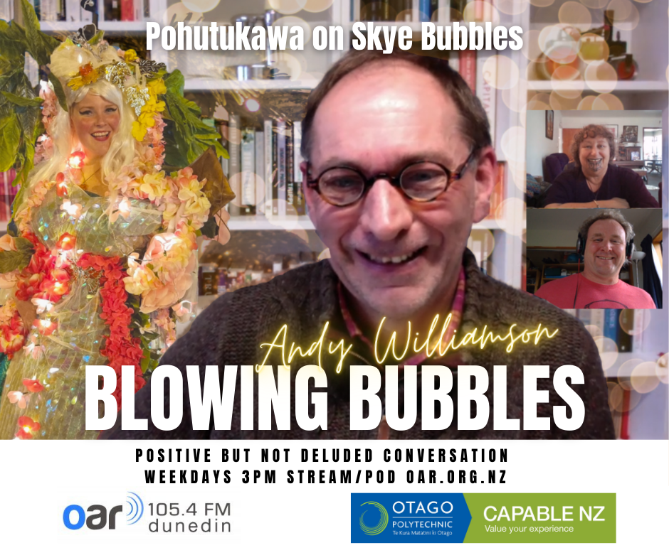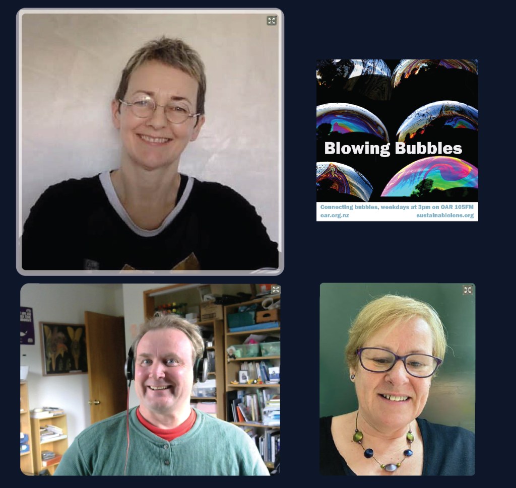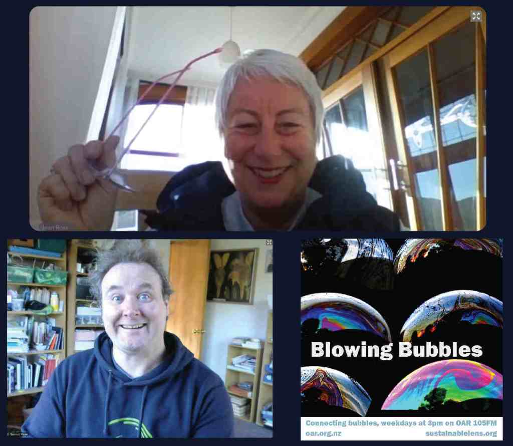 At the start of the Covid Lockdown we were asked to a daily radio show/podcast: Blowing Bubbles. It is broadcast on Otago Access Radio (3pm NZ) and podcast from there and sustainablelens.org. Positive conversations with people in their bubbles around the world. https://www.facebook.com/BubblesBySustainableLens/