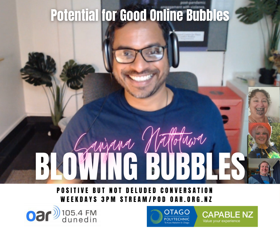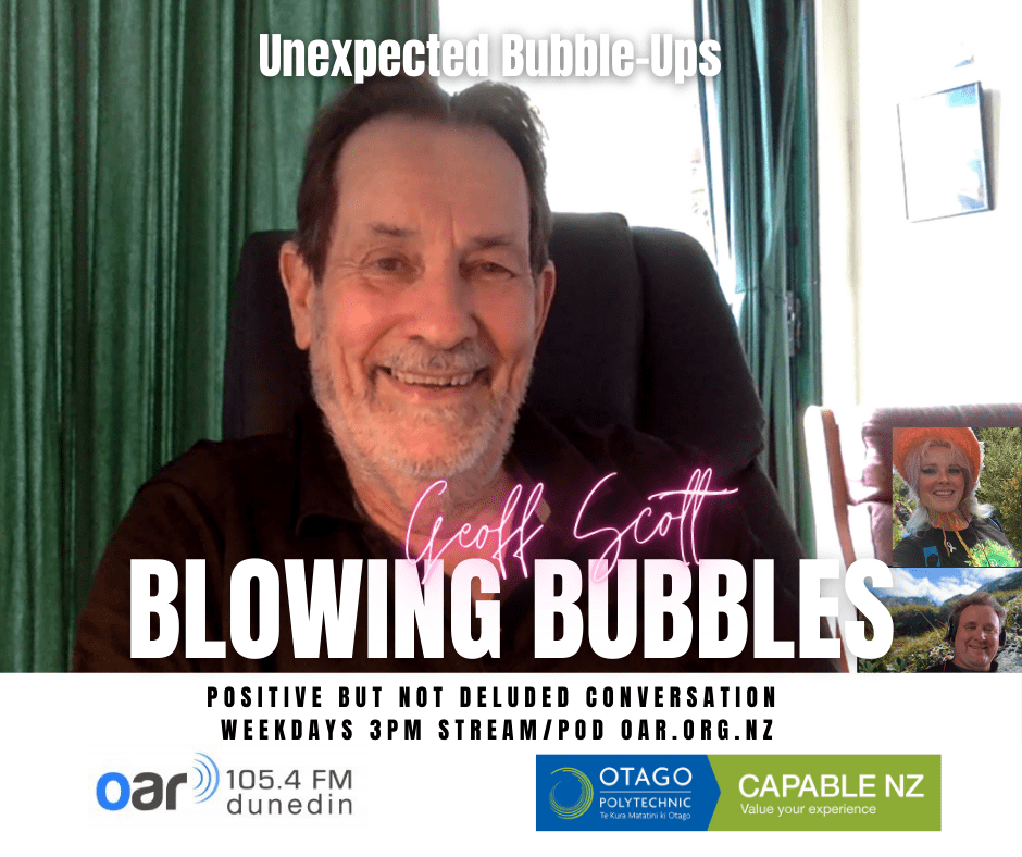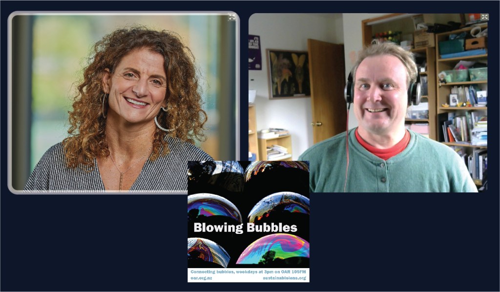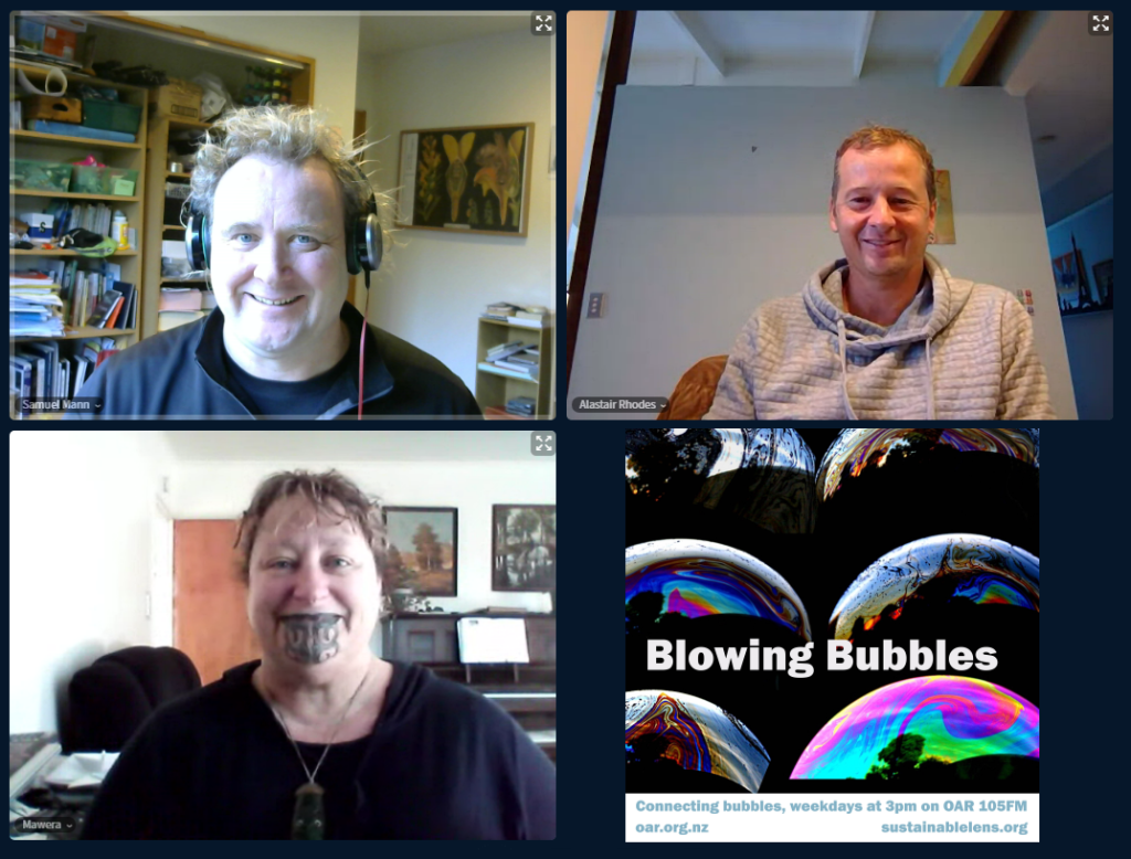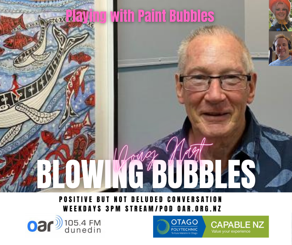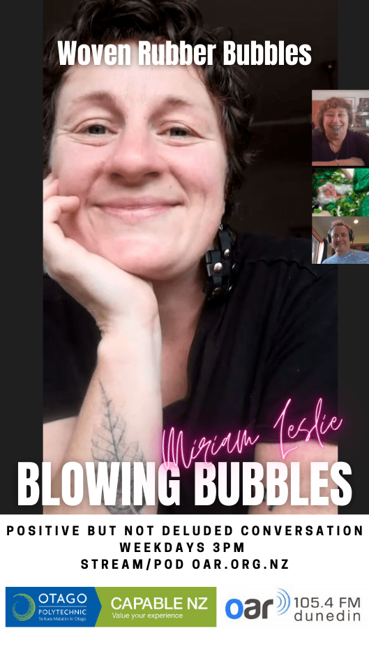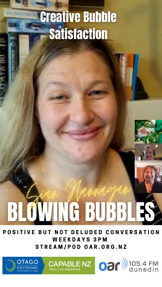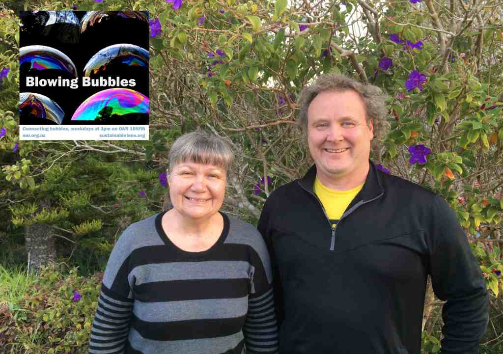 At the start of the Covid Lockdown we were asked to a daily radio show/podcast: Blowing Bubbles. It is broadcast on Otago Access Radio (3pm NZ) and podcast from there and sustainablelens.org. Positive conversations with people in their bubbles around the world. https://www.facebook.com/BubblesBySustainableLens/