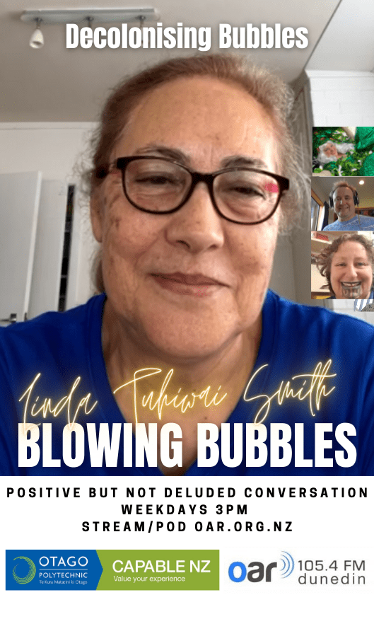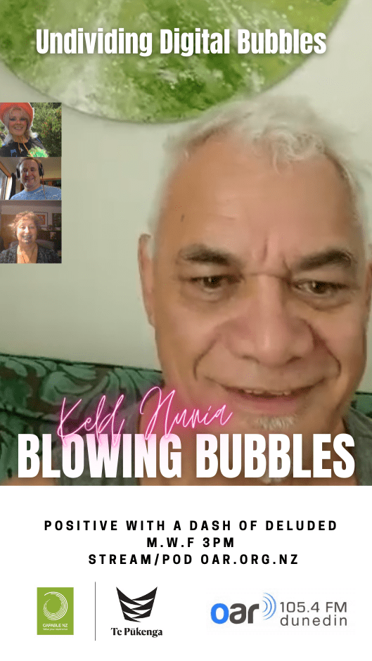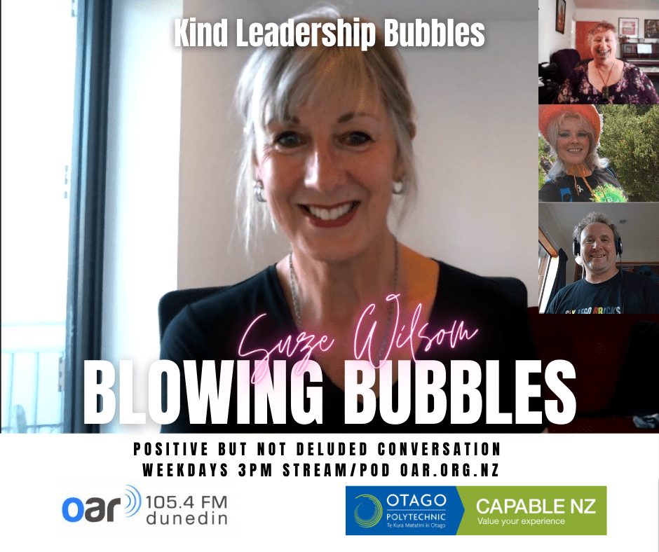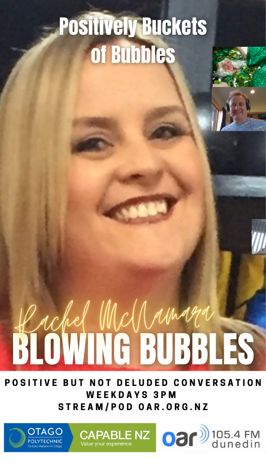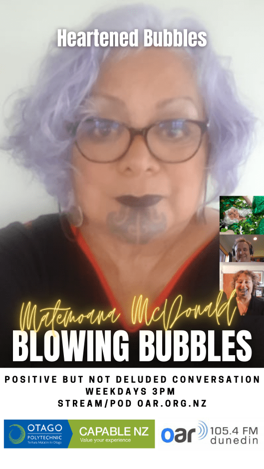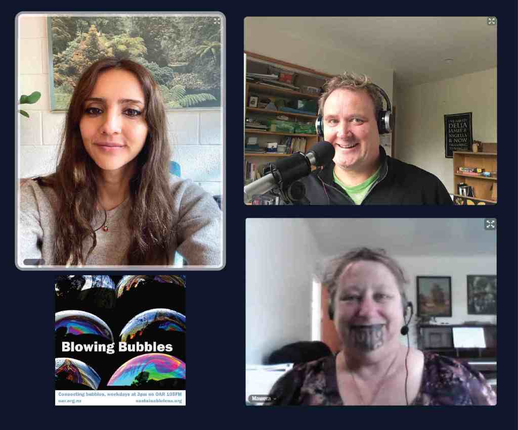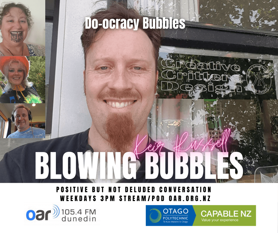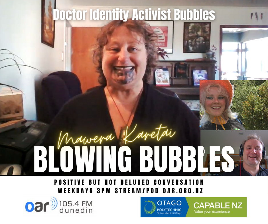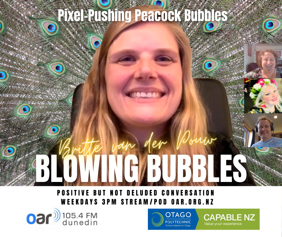 At the start of the Covid Lockdown we were asked to a daily radio show/podcast: Blowing Bubbles. It is broadcast on Otago Access Radio (3pm NZ) and podcast from there and sustainablelens.org. Positive conversations with people in their bubbles around the world. https://www.facebook.com/BubblesBySustainableLens/