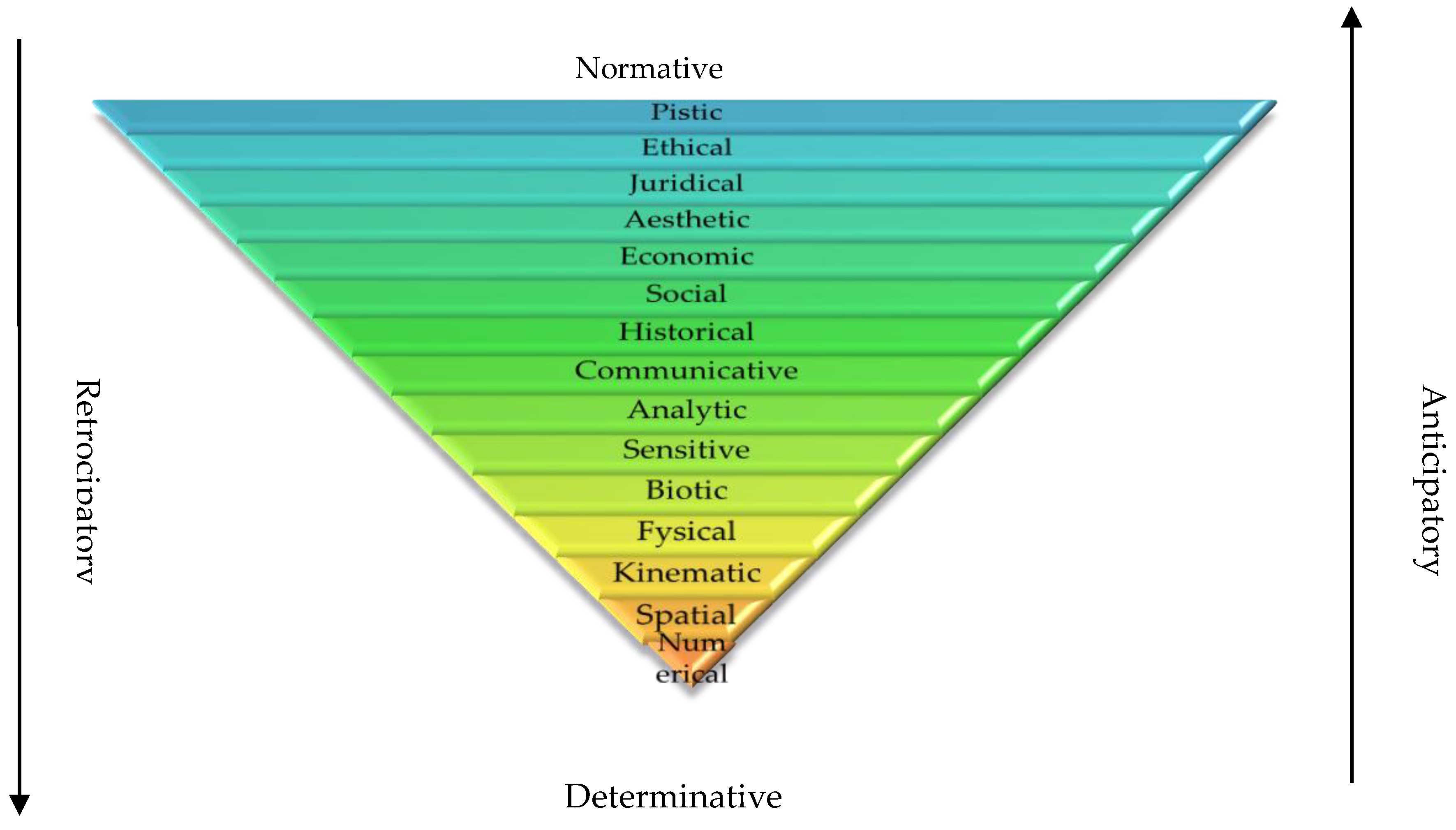 The first three modal spheres (numerical, spatial and kinematic), are the most fundamental and determinative ones. The higher in the ranking, the more the normative character is highlighted. The highest modal spheres (e.g., pistic, ethical, legal), are based more on human value judgments than the lower ones. The spheres refer to each other by anticipations and retrocipations. In this way, one modality is metaphorically described by the idiom of another [9] (p. 109). Heritage, for example, can be described on the basis of economic value, which in turn can be expressed in price (the numerical aspect). Such a “backward” relationship, although it is accompanied by the loss of a certain meaning, is called a retrocipation by Dooyeweerd. Additionally, in the reverse sense heritage is anticipatory, related to the legal, ethical and pistic aspects, for example in the form a protected monument prescribed by law, a site that is accessible to everyone, or a memorial, thus gaining in significance. Dooyeweerd considered this system of modal spheres, anticipation and retrocipation, the “cosmic order of time”.