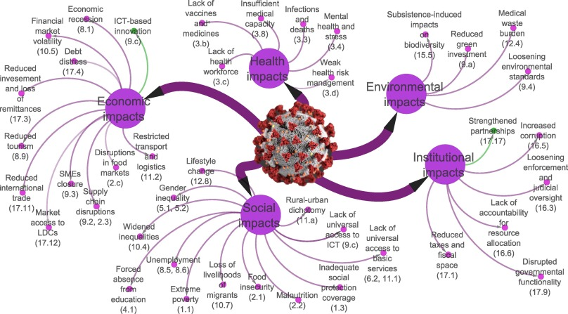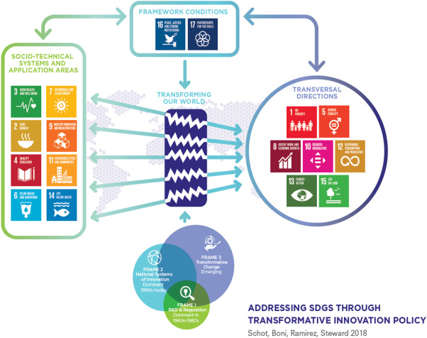 A first type is SDGs which we refer to as “socio-technical systems” that describe areas of provision of basic needs…The second type is SDGs that express new social and ecological directionalities that need to be incorporated in the process of socio-technical system change. These directionalities are captured in the following SDGs: No Poverty (SDG 1); Gender Equality (SDG 5); Decent Work and Economic Growth (SDG 8); Reduced Inequalities (SDG10); Responsible Production and Consumption (SDG 12); Climate Action (SDG 13) and Life on Land (SDG 15). In Fig. 1 we use the notion of traversal directions because these directionalities need to intersect with socio-technical systems. The third type of SDG refers to the requirement for wider participation and networking across actors which assumes specific governance and political conditions in which societies can discuss, negotiate and navigate different transformational trajectories of development