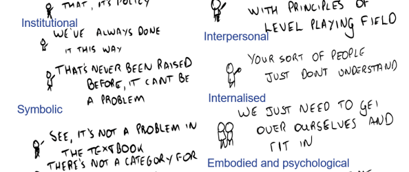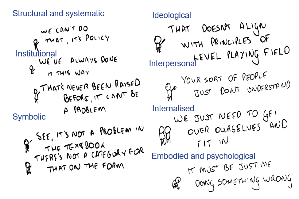 The framework is more than a list of categories. It’s a lens to interrogate practice. For each level, we identified concrete statements you might hear in real organisational contexts—such as “it’s just the way things are” (ideological), or “we don’t have anyone who can lead that” (institutional), or “I’m not sure I belong here” (internalised). Paired with these, we offered targeted levers: what might actually work to shift things at that level.
