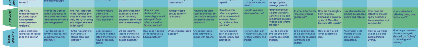 This reflective row is part of that evolution. It brings to the surface what was already there, and strengthens the ethical and developmental spine of the framework – making space for researchers to attend to who they are becoming as much as what they are researching.